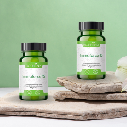 Immuforce 15 contiene 4 cepas de bacterias del ácido láctico y 15 mil millones de colonias por cápsula. Se ha demostrado que una alta concentración de bacterias lácticas, cuidadosamente elegidas, permite actuar más eficazmente contra las reacciones inadecuadas del sistema inmunológico intestinal y los signos inflamatorios asociados a la Enfermedad Inflamatoria Intestinal Crónica (EII), la enfermedad de Crohn o la colitis ulcerosa. .